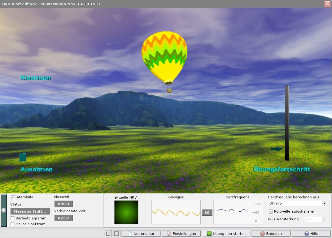 Zu sehen ist ein typischer Übungsbildschirm für das Biofeedback Training. Das Gehirn erreicht mittels einer operanten Koniditionierung, dass der Ballon so hoch wie möglich steigt, was nur durch die Erhörung der Herzkohärenz erreicht werden kann. Das Trainingslevel kann dann immer wieder neu angepasst werden, um den Trainingseffekt immer weiter ausbauen zu können.